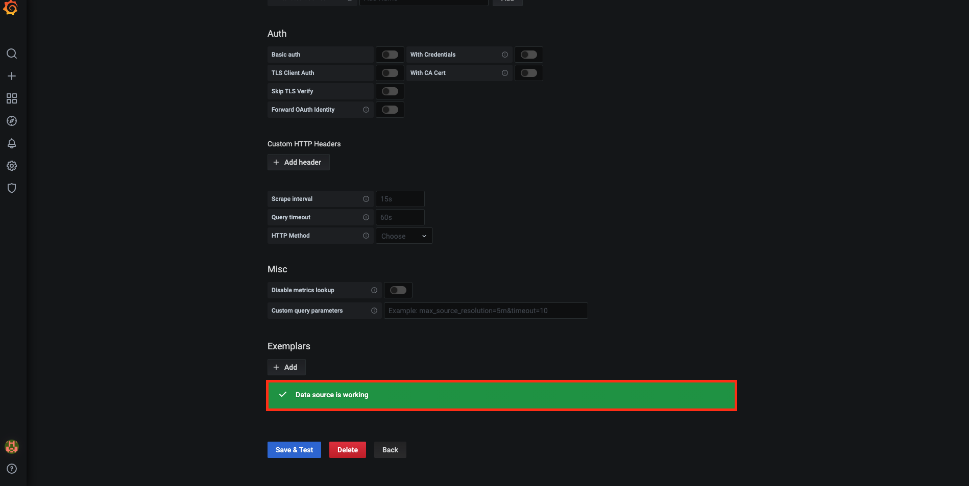 PrometheusURL을 적어주면 된다. 현재는 도커 컨테이너 기반이니까 "컨테이너 이름:포트"로 접속이 가능하다. 따라서 현재는 "prometheus:9090"으로 접속하면 된다.