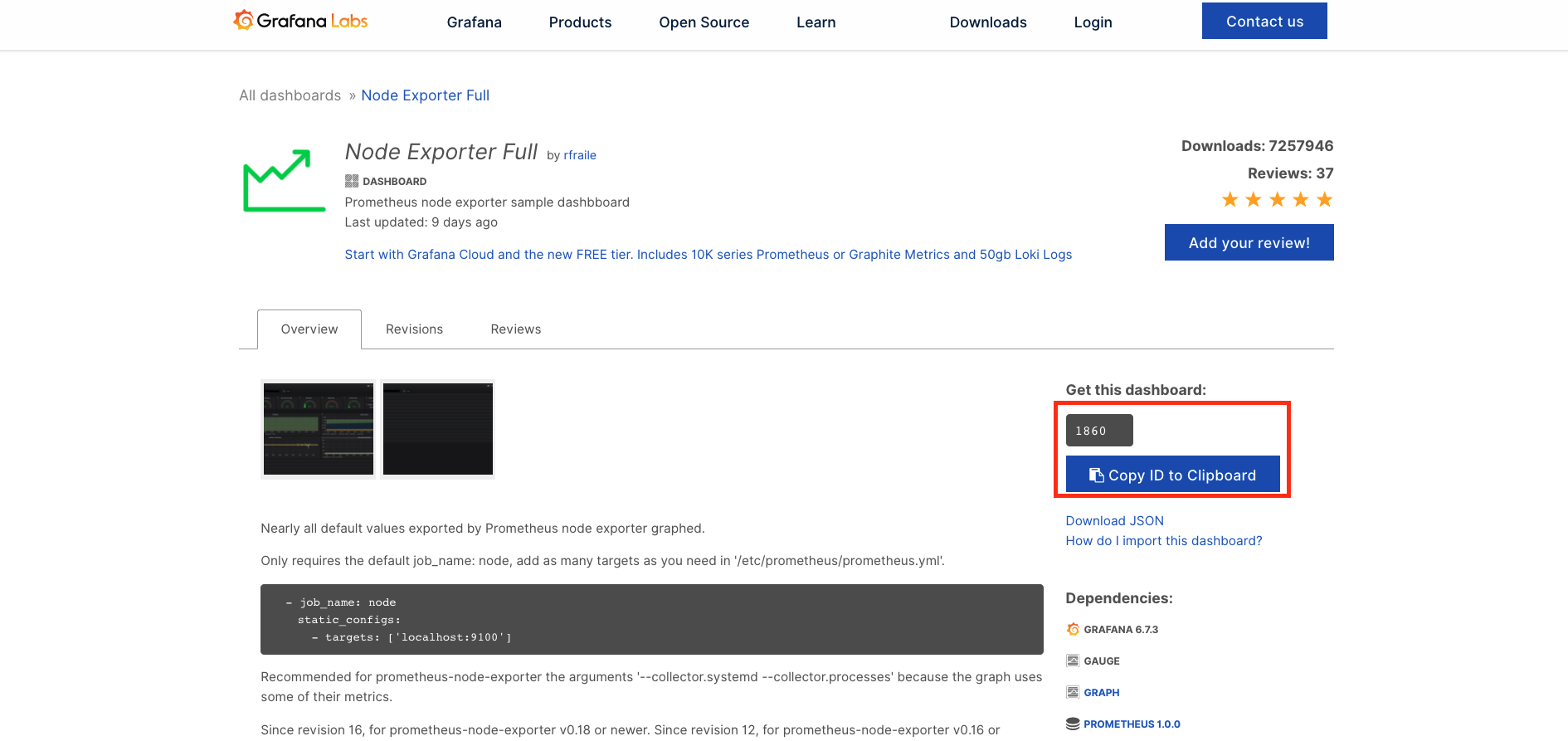 Grafana에서 대시보드를 구축해보자. 먼저 터미널에 다음을 입력한다.# local $ docker compose up -d grafana # server $ sudo systecmctl restart grafana-serverGrafana로 대시보드를 구축할 때 정말 좋은 점은node-exporter같이 많이 사용하는Exporter에 대한 대시보드가 이미 공유되어서 그것을 손쉽게 사용할 수 있다는 것이다. 먼저 다음 경로로 이동한다.그러면 아래 화면이 보이는데 다음을 복사한다.