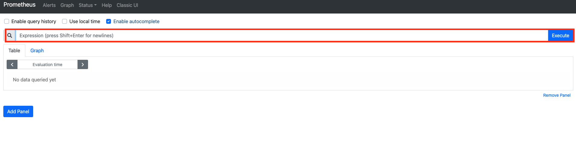 # ... scrape_configs: # ... - job_name: 'node-exporter' scrape_interval: 5s static_configs: - targets: ['node-exporter:9100']static_configs밑에targets에서node-exporter가 구동된 인슨턴스들의 "IP:9100"을 적어주면,Prometheus가scrape_interval에 설정된 주기마다 각 인스턴스들에서 수집되는 메트릭을 스크래이핑하여 저장한다. 이제 Prometheus`를 구동시켜보자.# local $ docker compose up -d prometheus # server $ sudo systecmctl restart prometheusPrometheus UI에서 다음 쿼리를 입력해보자.up