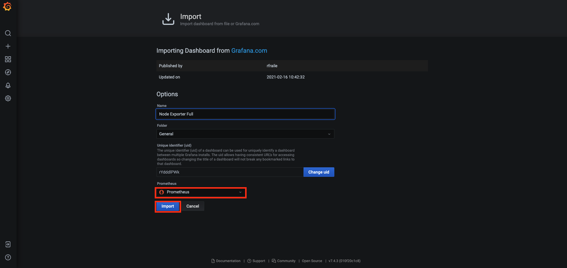 그 후 "Datasource"에서 "Prometheus"를 선택한 뒤 "Import"를 누른다.