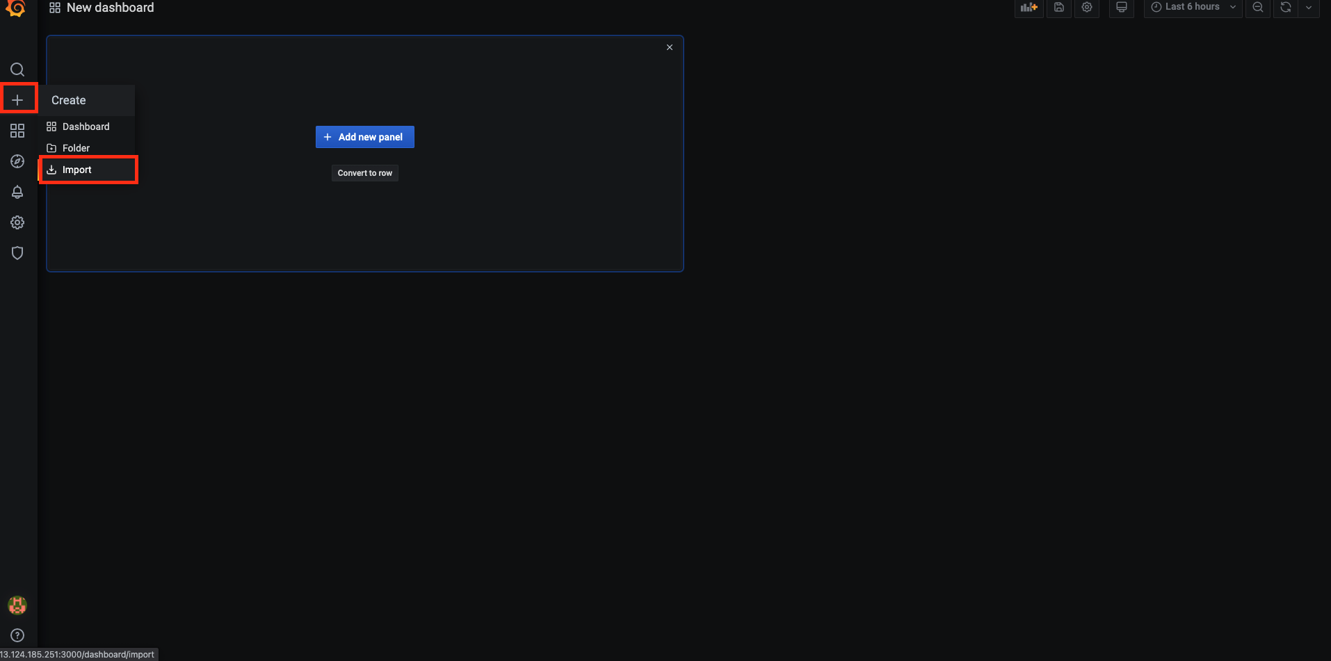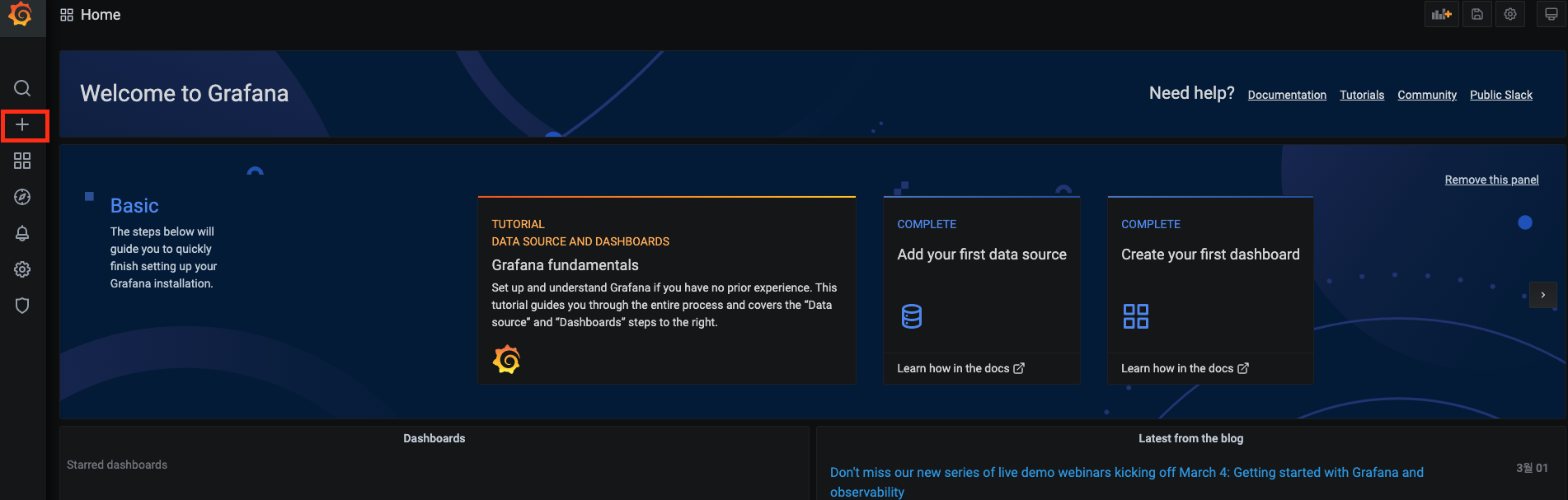 먼저 그라파나에 접속한다. 그 후 "+" 버튼을 누른다.