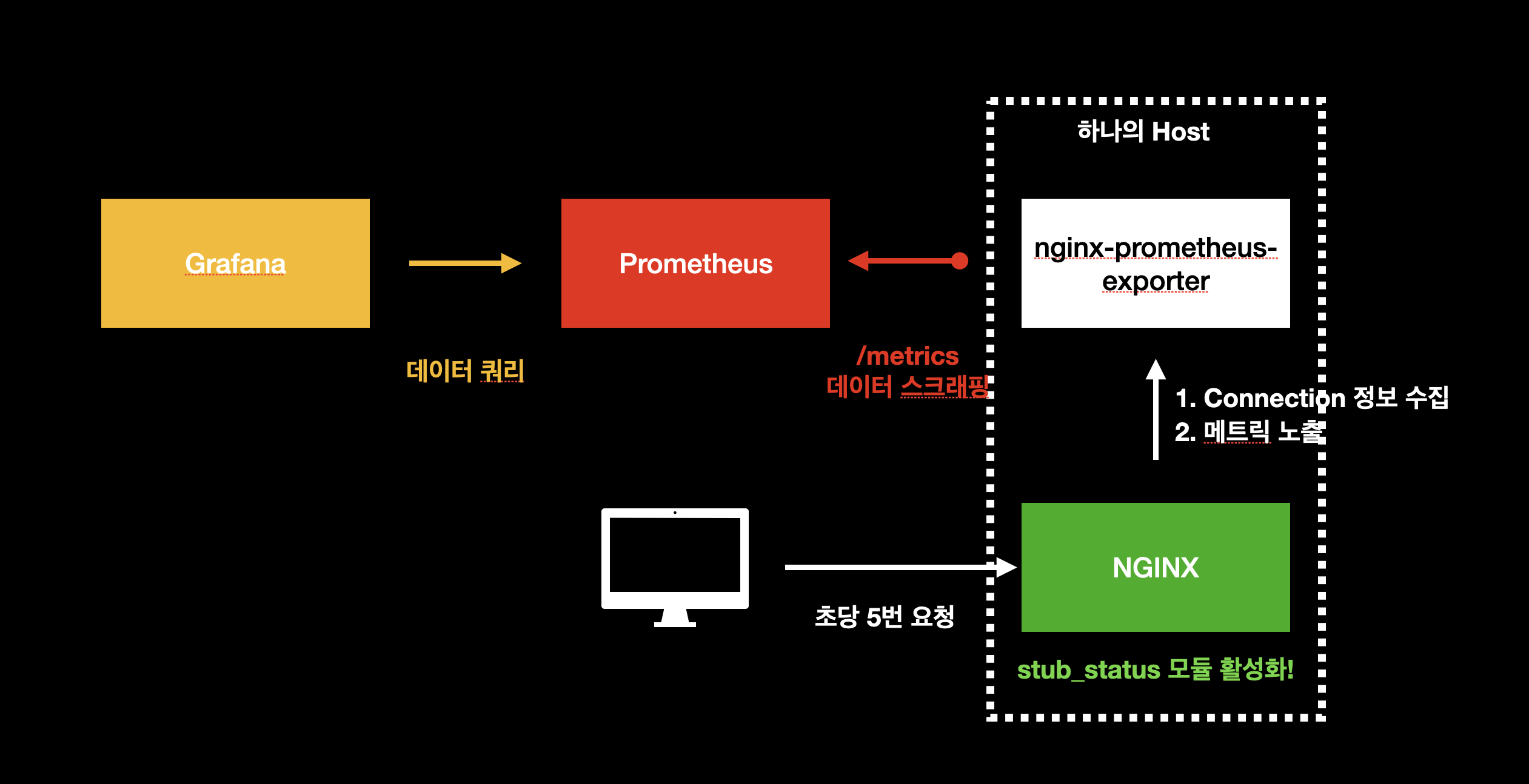 Nginx의stub_status모듈을 활성화시키면 이런 커넥션 정보를 얻을 수 있다. 오픈 소스에는 볼 수 있는 지표가 적지만, 상용 버전에는 꽤 많은 지표를 확인할 수 있다. 이에 대한Nginx설정은 추후 절 "메트릭 수집을 위한 각 컴포넌트 설정"에서 다룬다.하지만 모듈을 활성화시켰다고 해서, 커넥션에 대한 메트릭이 자동적으로 수집되는 것은 아니다. 이를 위해서