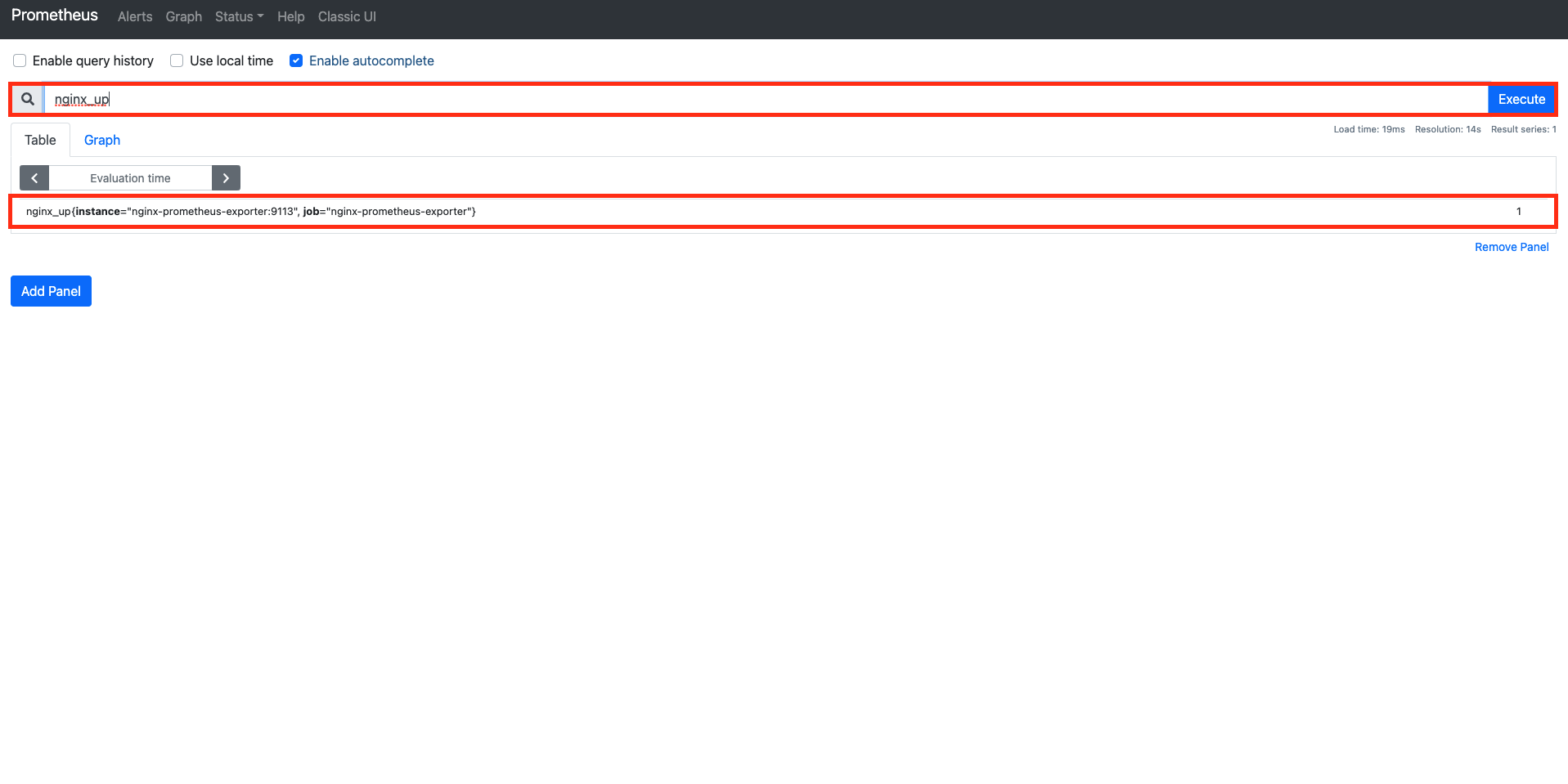 Prometheus UI에서 다음을 쿼리해보자.nginx_up다음과 같이 나오면 성공이다.