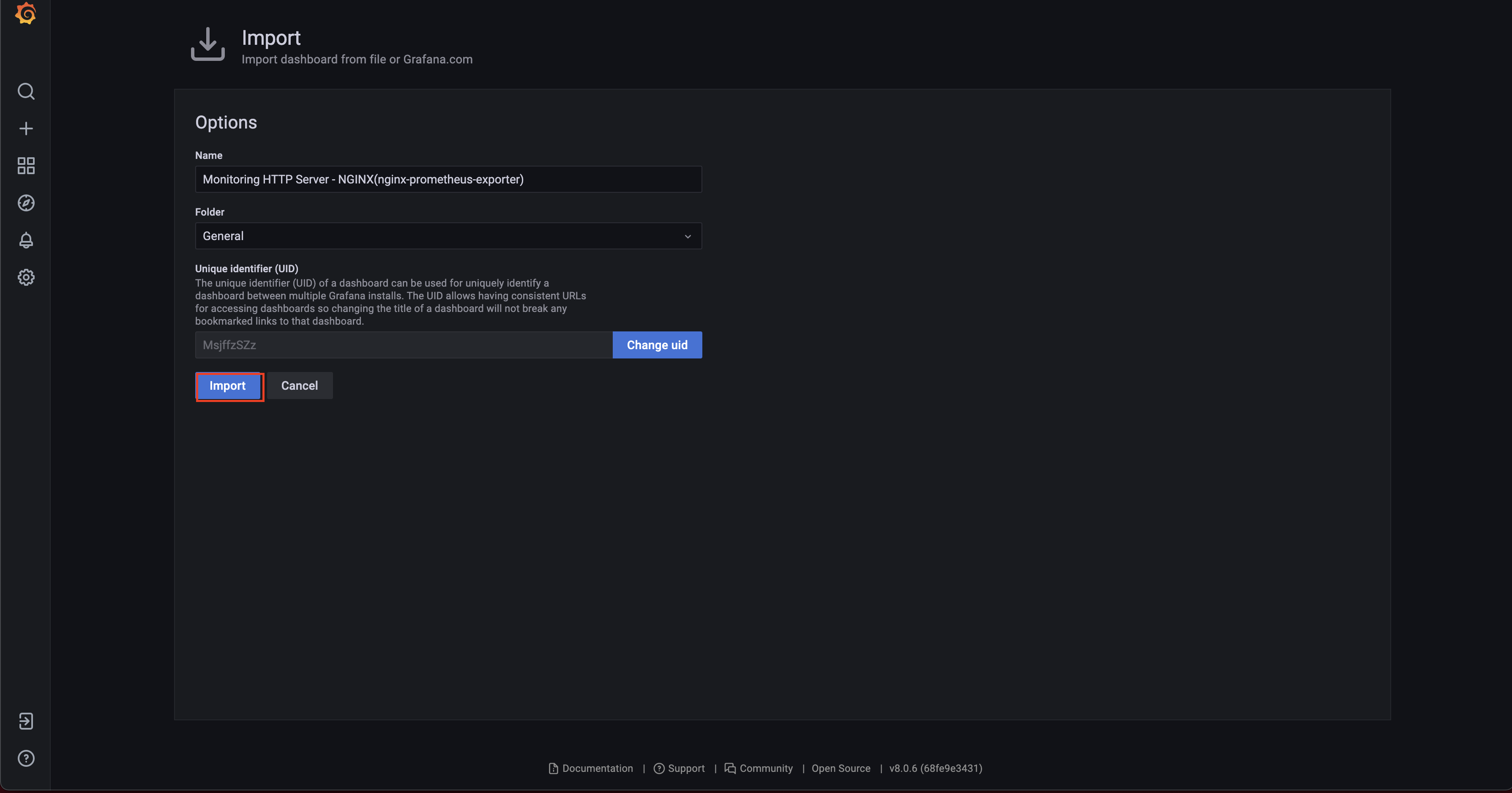 그럼 위와 같이 입력값들이 자동적으로 채워진다. "Import"를 누른다.