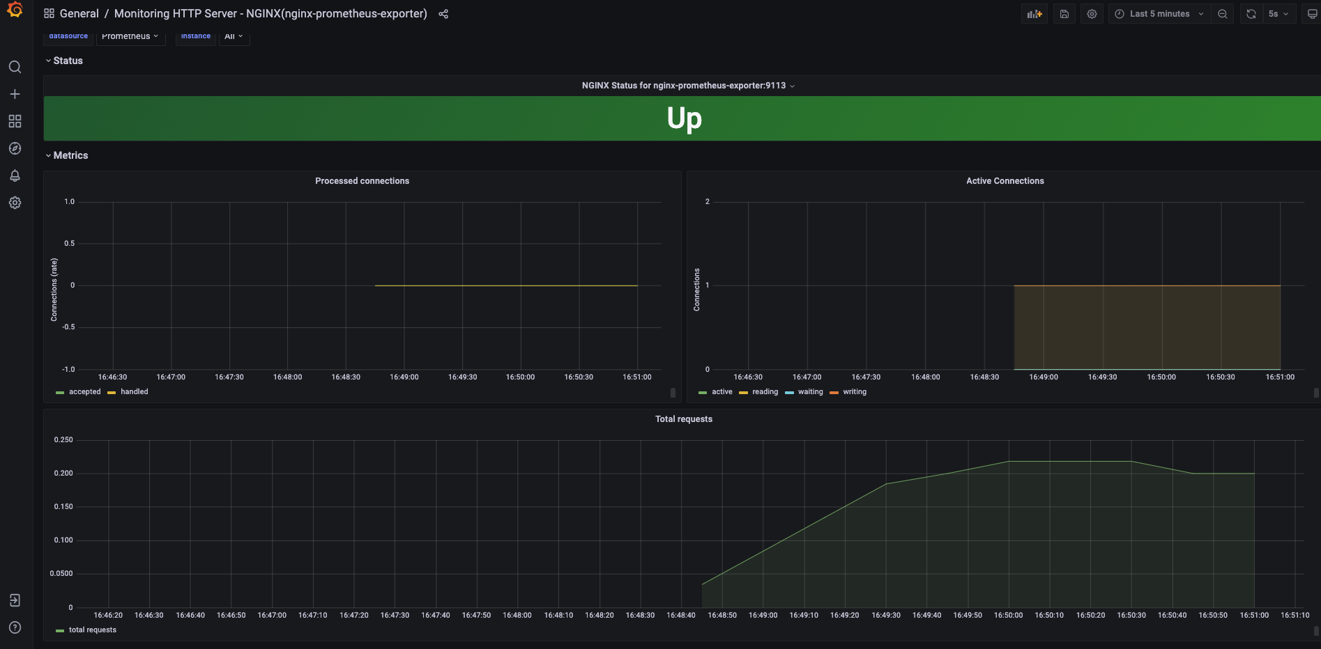 # my global config global: scrape_interval: 15s # By default, scrape targets every 15 seconds. evaluation_interval: 15s # By default, scrape targets every 15 seconds. external_labels: monitor: 'my-project' rule_files: scrape_configs: # ... - job_name: 'nginx-prometheus-exporter' scrape_interval: 5s static_configs: # nginx와 nginx-prometheus-exporter가 설치된 IP:9113 - targets: ['nginx-prometheus-exporter:9113']그리고