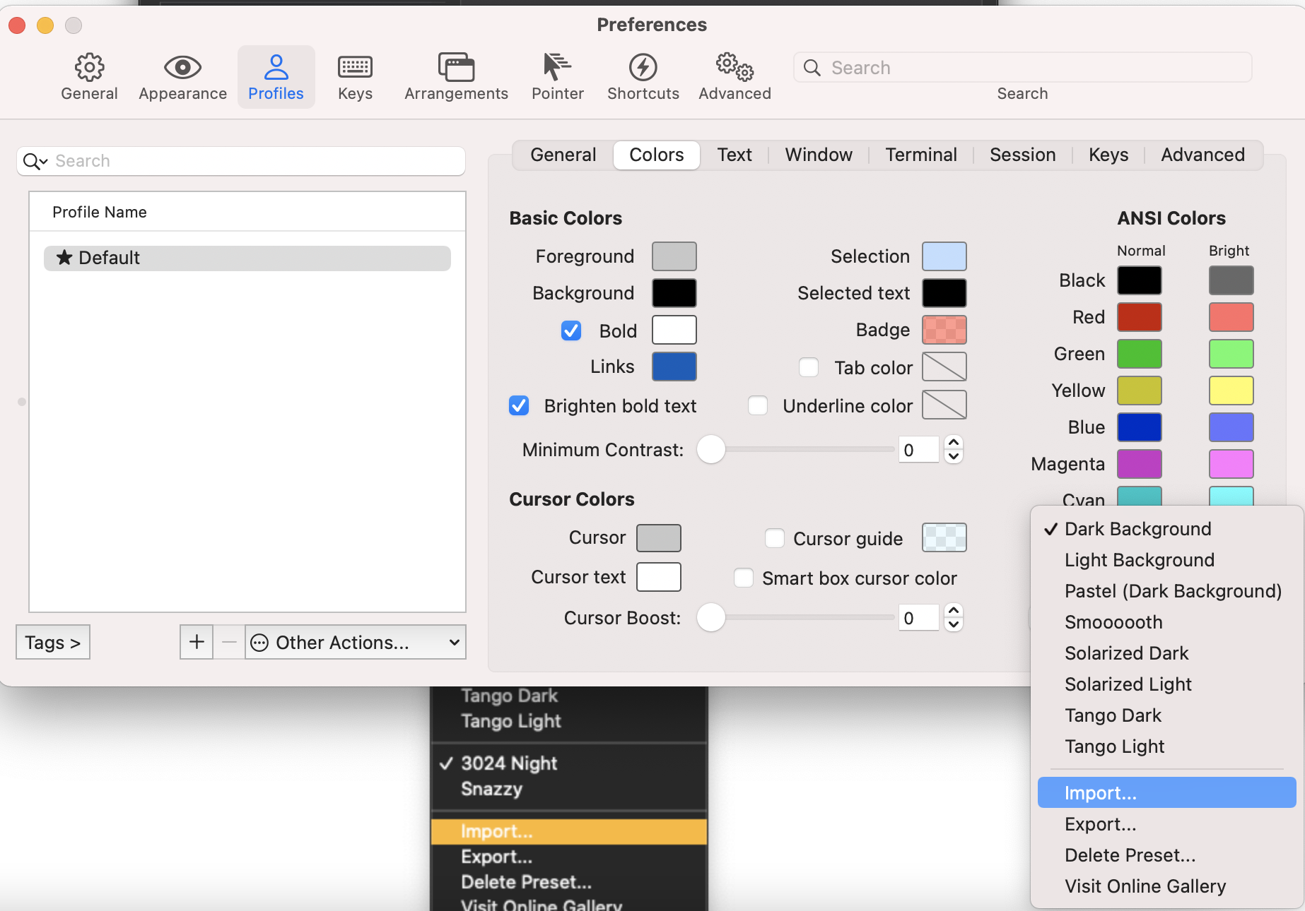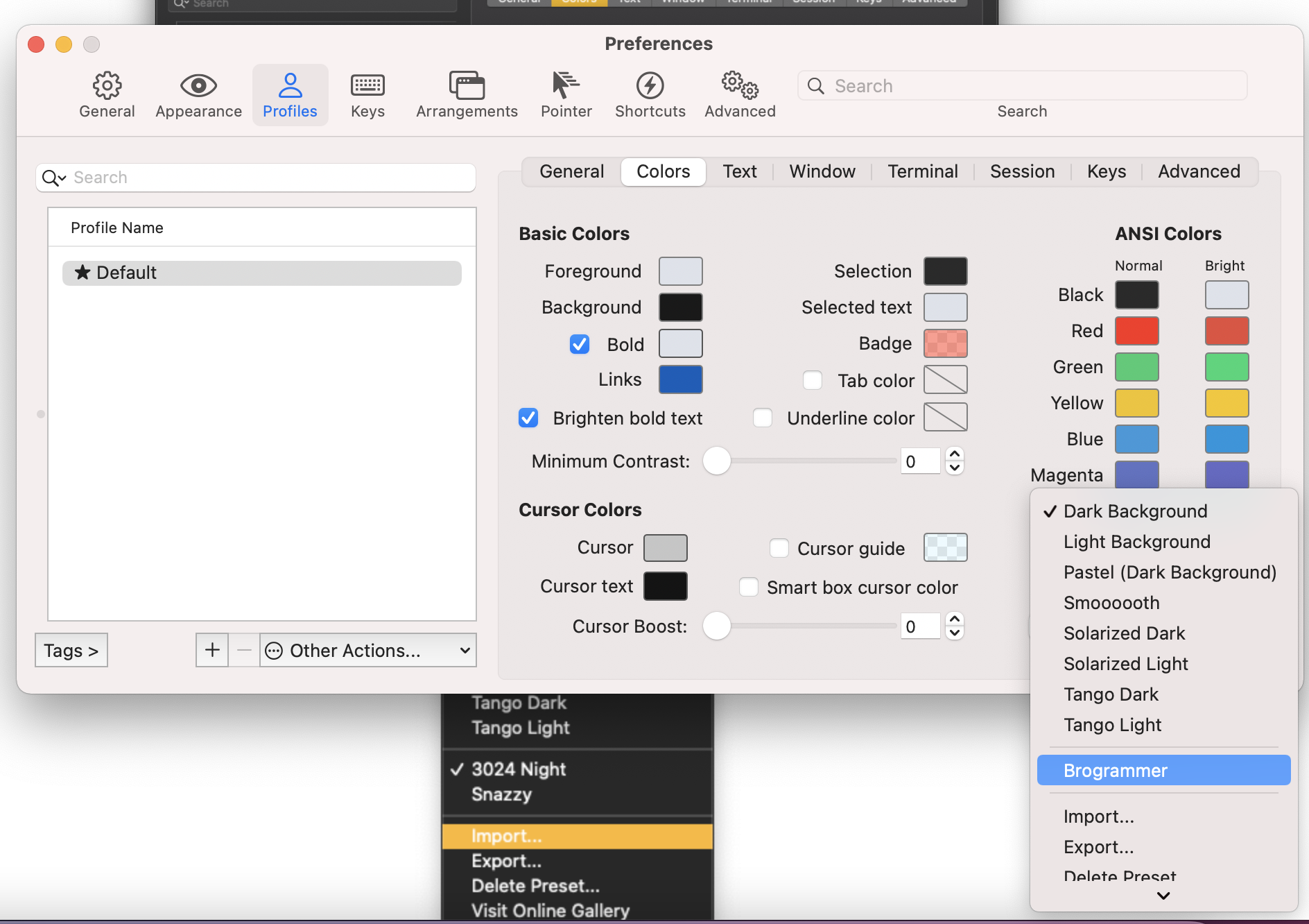 그럼 아까 복제한 레포지토리에서 schemes 디렉토리에서 원하는.itermcolors를 클릭한다. 필자의 경우 Brogrammer 테마를 설정했다.(필자 기준 테마 파일 경로는 다음과 같다. ~/Settings/iTerm2-Color-Schemes/schemes/Brogrammer.itermcolors) 설정이 되면 스크롤에서 설정한 테마가 나타난다.