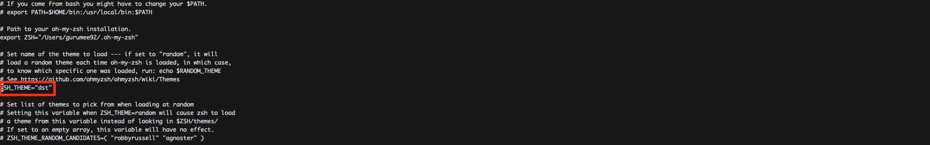 oh-my-zsh도 여러 테마가 있는데 이를 설정해보자. "~/.zshrc"를 열어서 ZSH_THEME="robbyrussell"라는 부분을 ZSH_THEME="dst"로 변경한다.