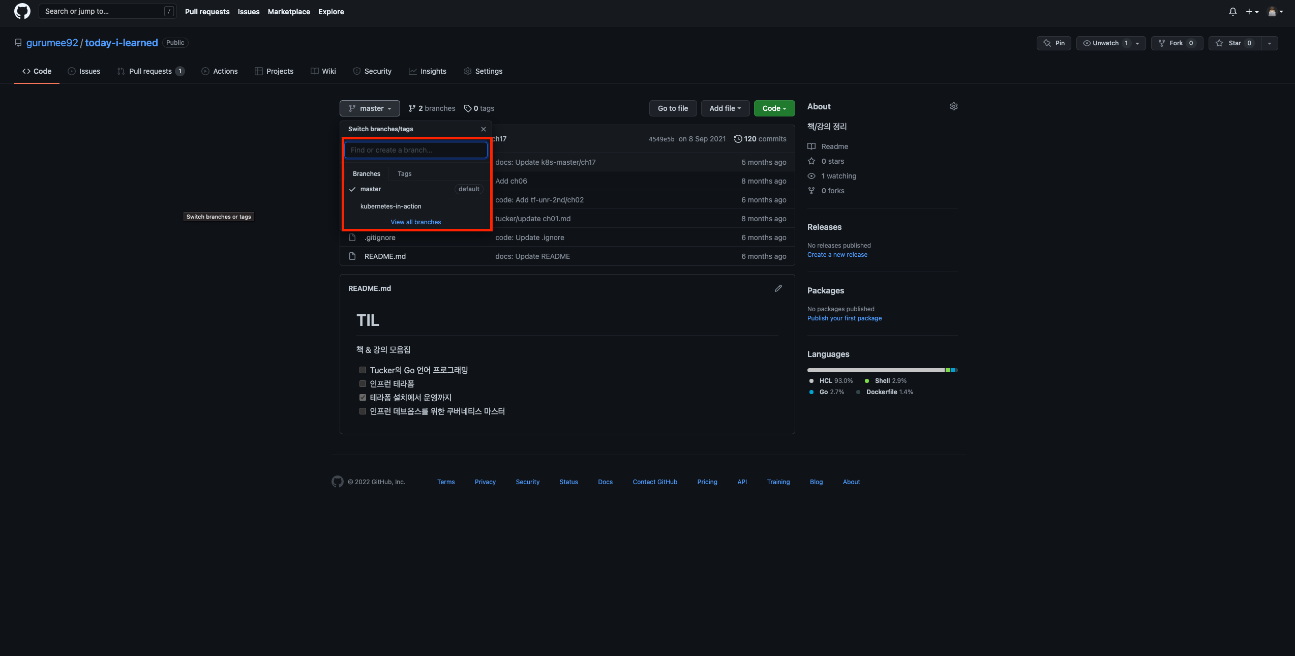 $ git branch -al ch02 ch03 ch04 ch05 ch06 ch07 ch08 ch09 ch10 ch11 ch12 ch13 * kubernetes-in-action master remotes/origin/HEAD -> origin/master remotes/origin/kubernetes-in-action remotes/origin/master현재 로컬 브랜치